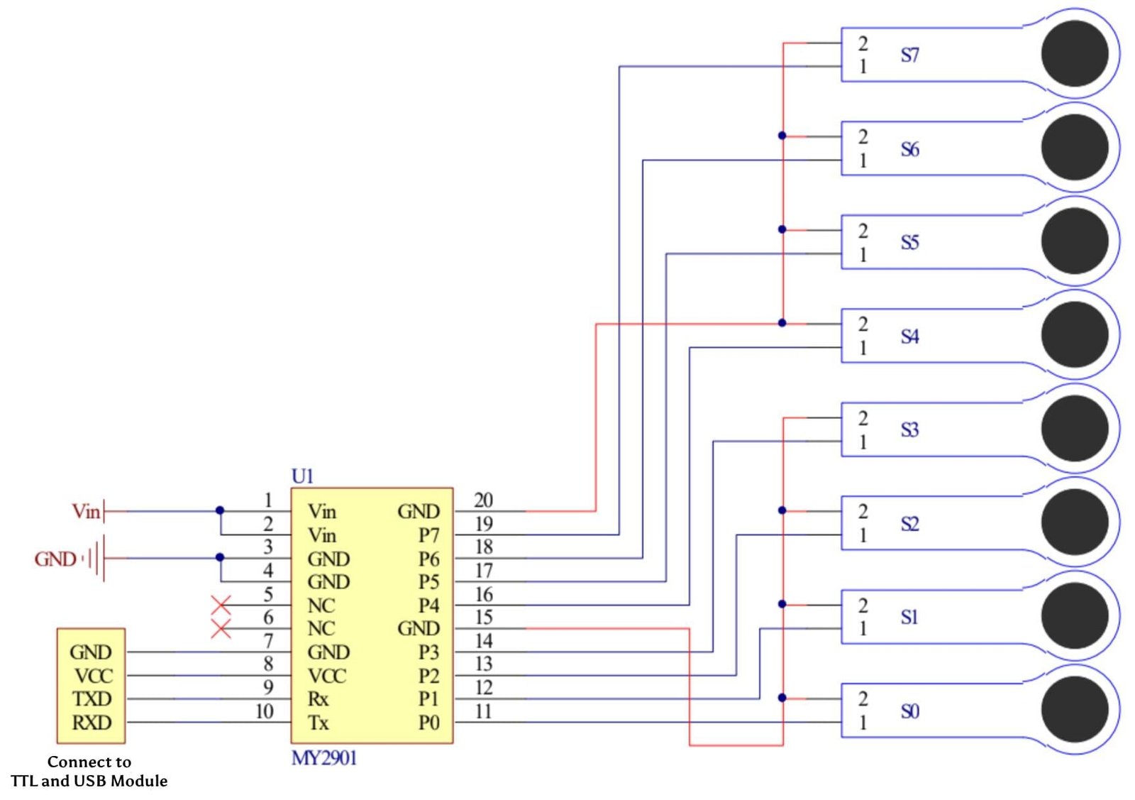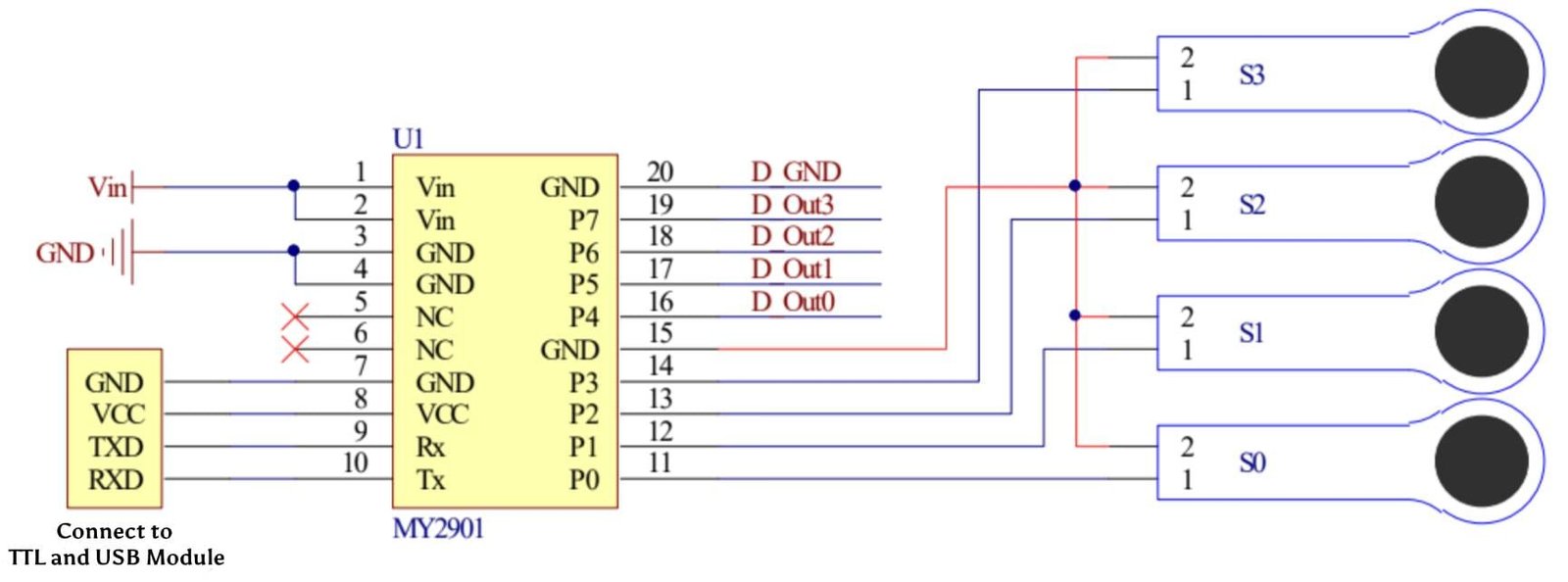 The MY2901 These are example circuit diagrams for the 4-channel and 8-channel MY2901 with the ZNS-01 insole flexible sensor.