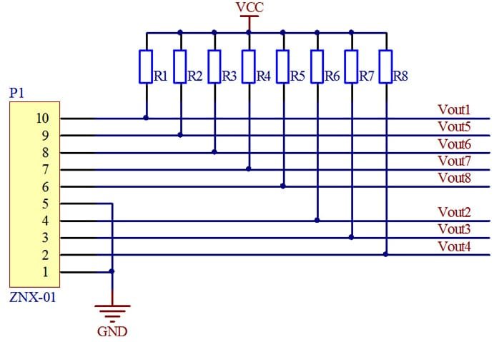 TheZNX-01 circuit employs the principle of resistance voltage division to measure the sensor’s resistance. By measuring the Vout voltage value and the voltage divider resistance value, the resistance value of the sensor’s sensitive point after the application of force can be calculated. Subsequently, the pressure value can be determined by referring to the pressure-resistance curve.