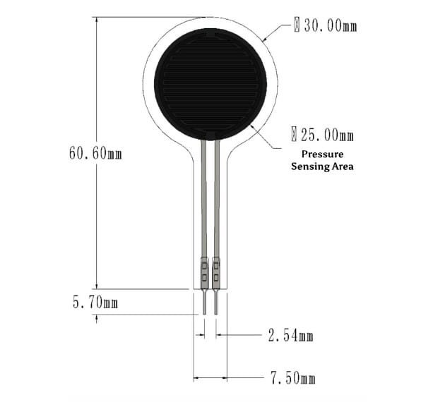 The MD30-60 thin film pressure sensor is a highly sensitive resistive sensor designed to detect and measure pressure by exhibiting a decrease in output resistance as the pressure applied to its surface increases. This unique characteristic allows for precise and accurate pressure measurement based on a specific pressure-resistance relationship.